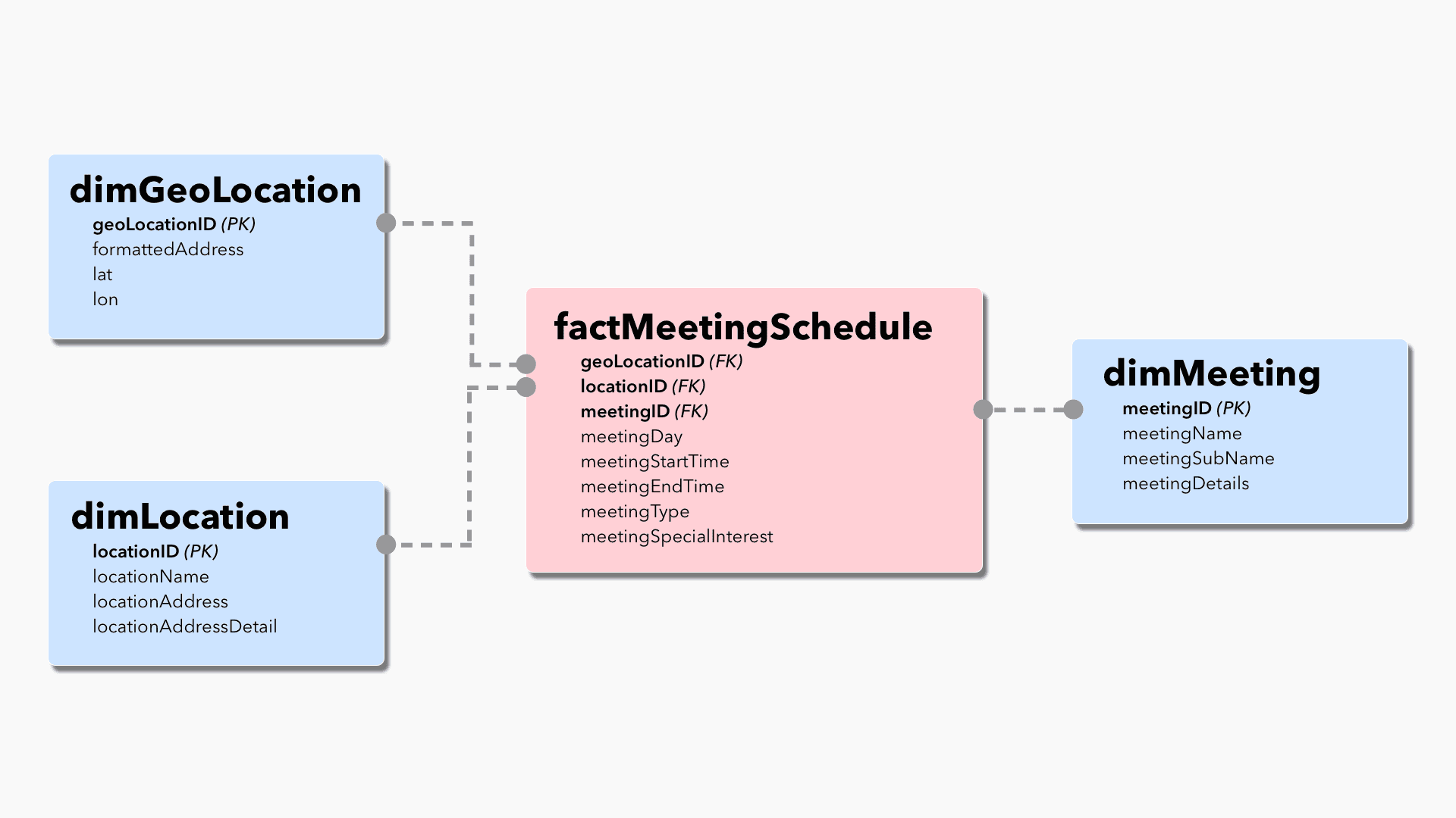 The data query for my front-end interface pulls geolocation, location, meeting, and schedule data from my PostgreSQL data structure for any meeting within a certain amount of hours from now and a certain distance from a specific location (defaulted to Parsons). These mile and distance values are passed into the query itself, ensuring we're querying the minimum amount of data needed to display only relevant meetings and locations.