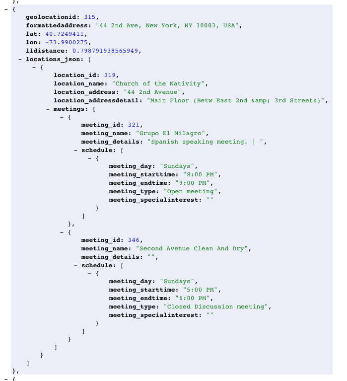 The query returns one row per geolocation that matches our location constraint with a nested structure containing information about each location within a geolocation, each meeting within that location, and the schedule within each meeting that matches our time constraint: