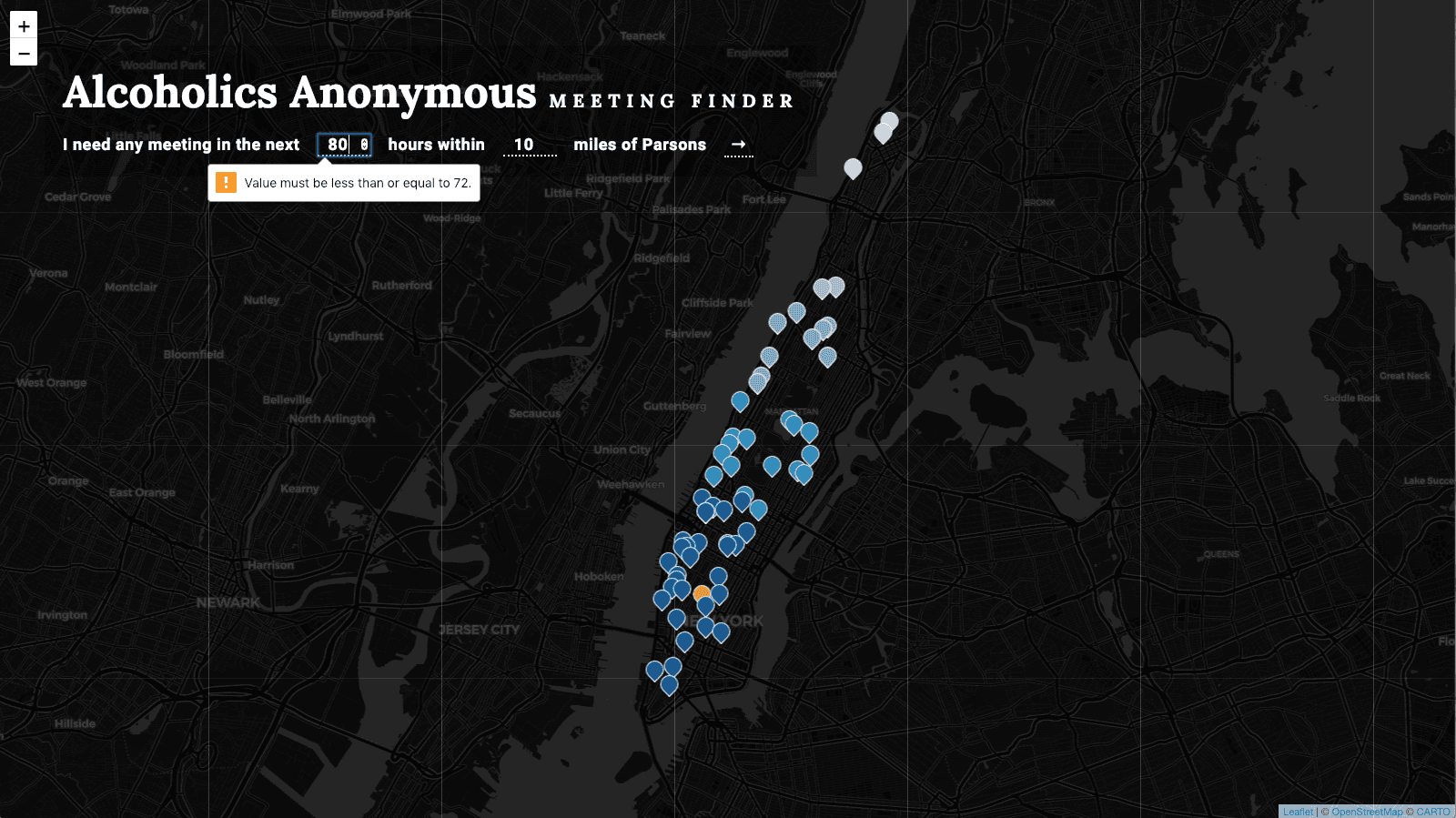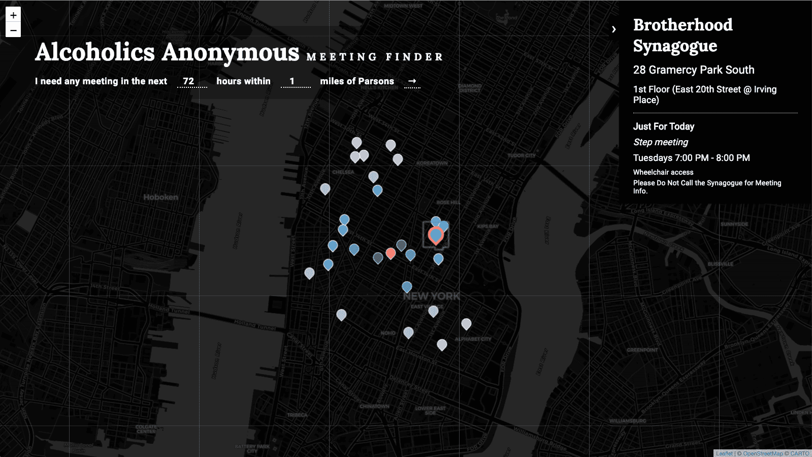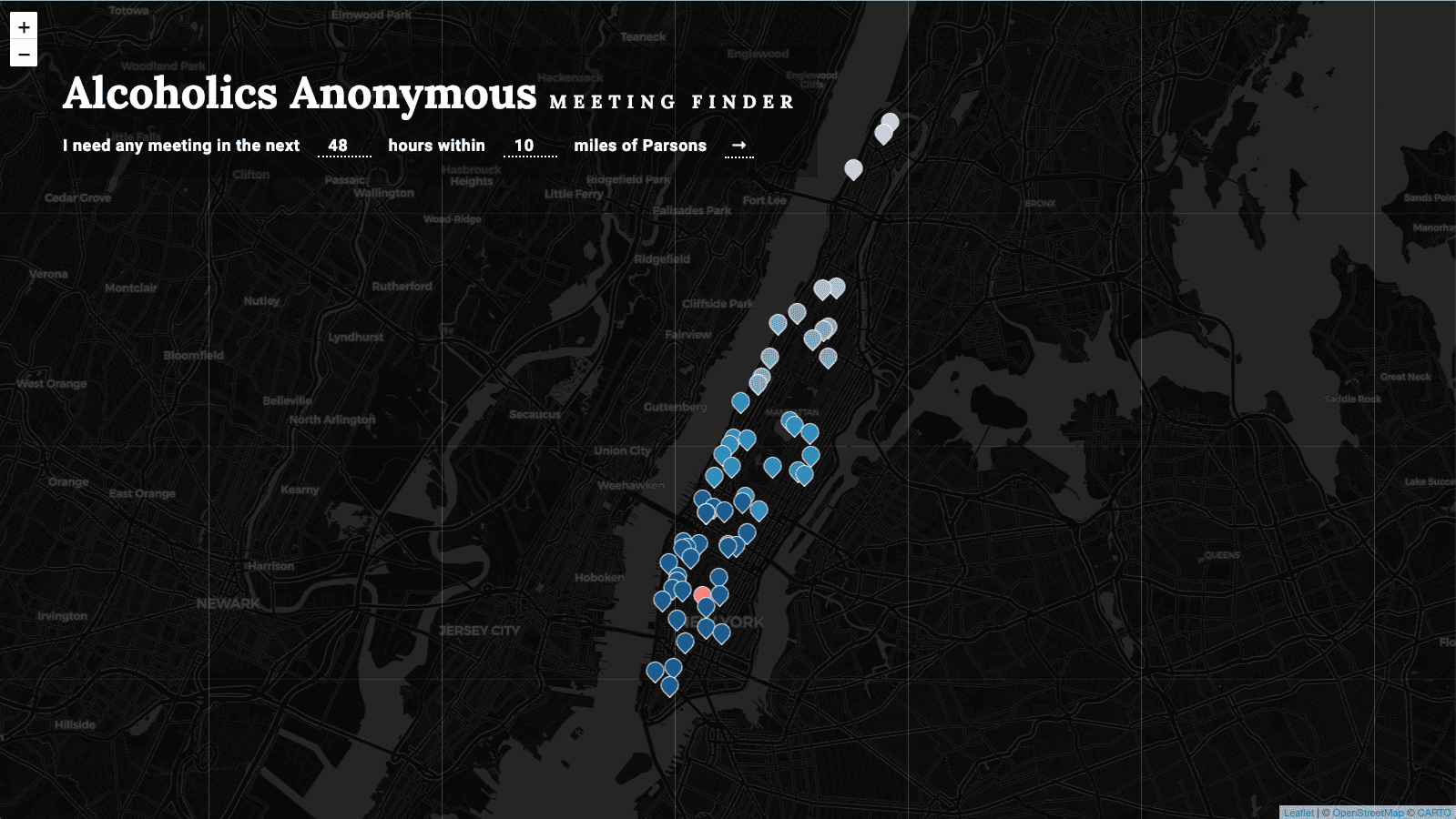 This visualization maps Alcoholics Anonymous meetings in Manhattan happening within a certain distance and timeframe from your current location.