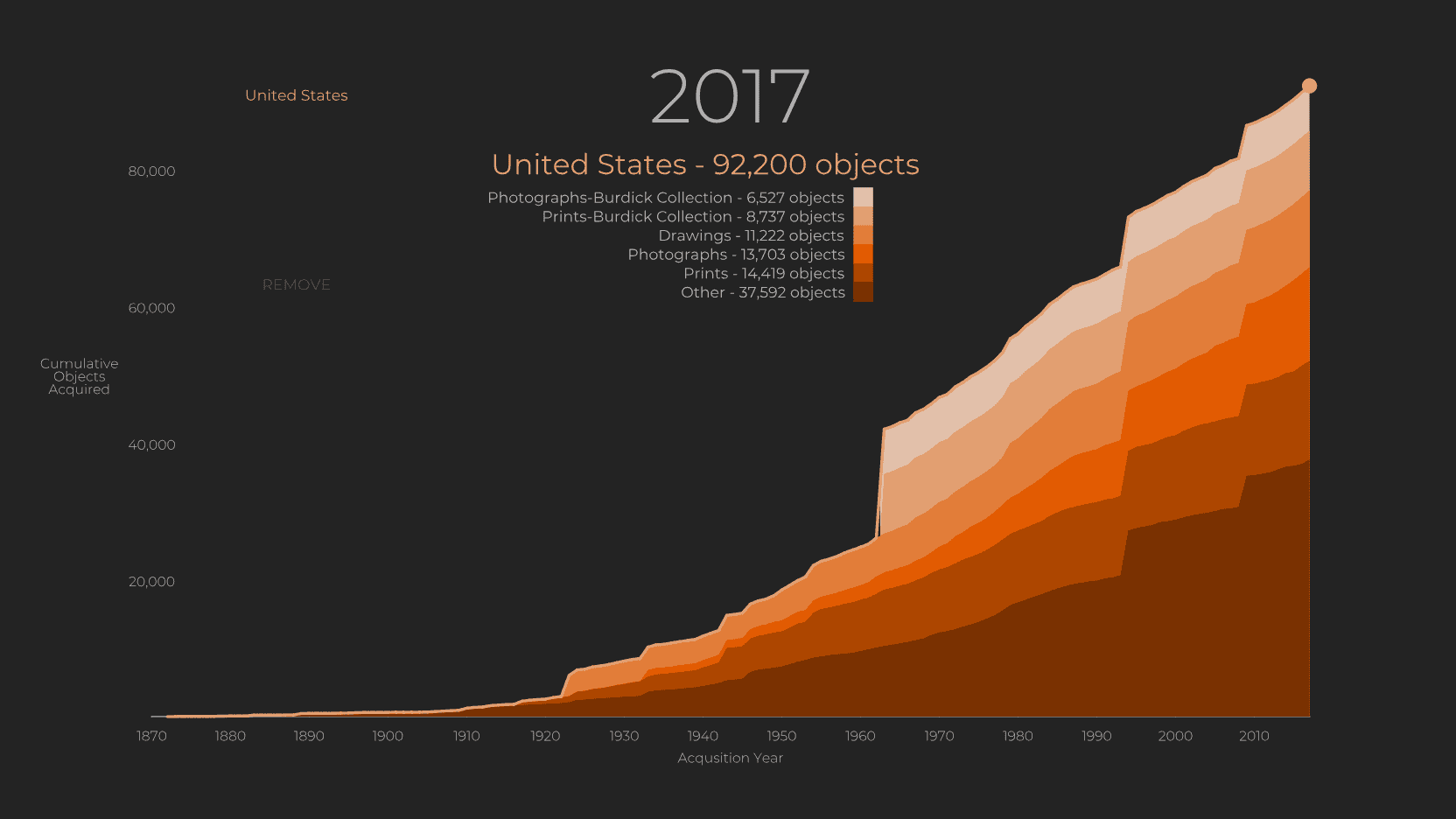 The final data processing step was aggregating object totals at various levels of detail. I calculated year-to-year cumulative total for each country and classification, along with the combination of these two variables, and exported these statistics in JSON files for my front-end visualization. I maintained totals for the ten most popular countries in the collection, and the top five classifications within those countries.
