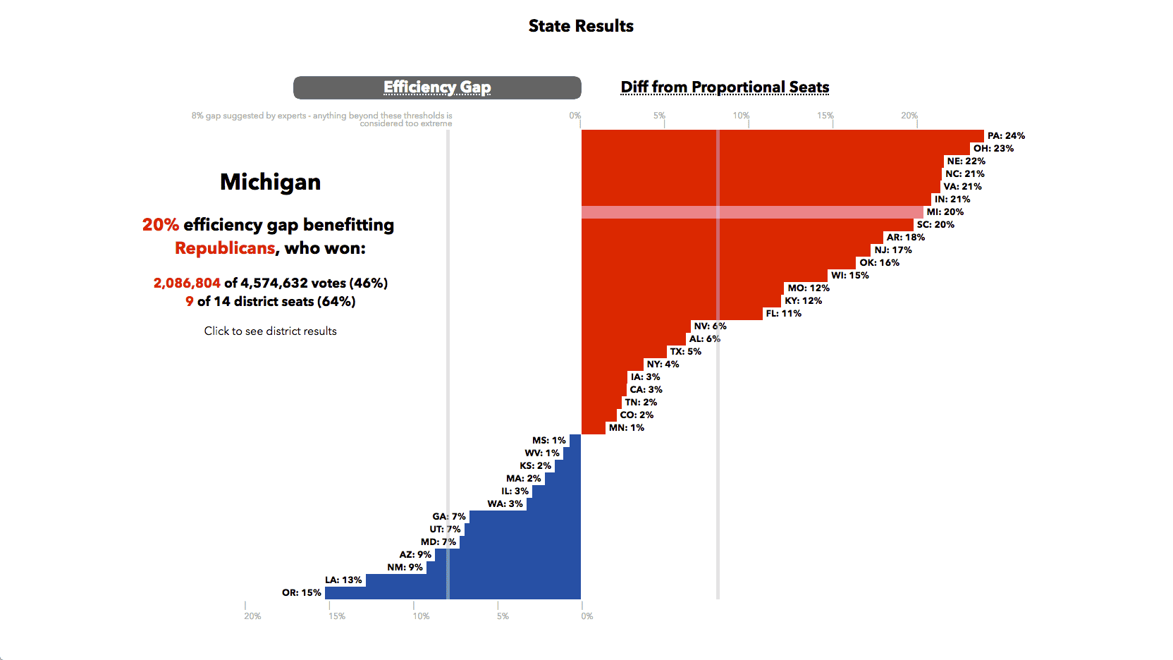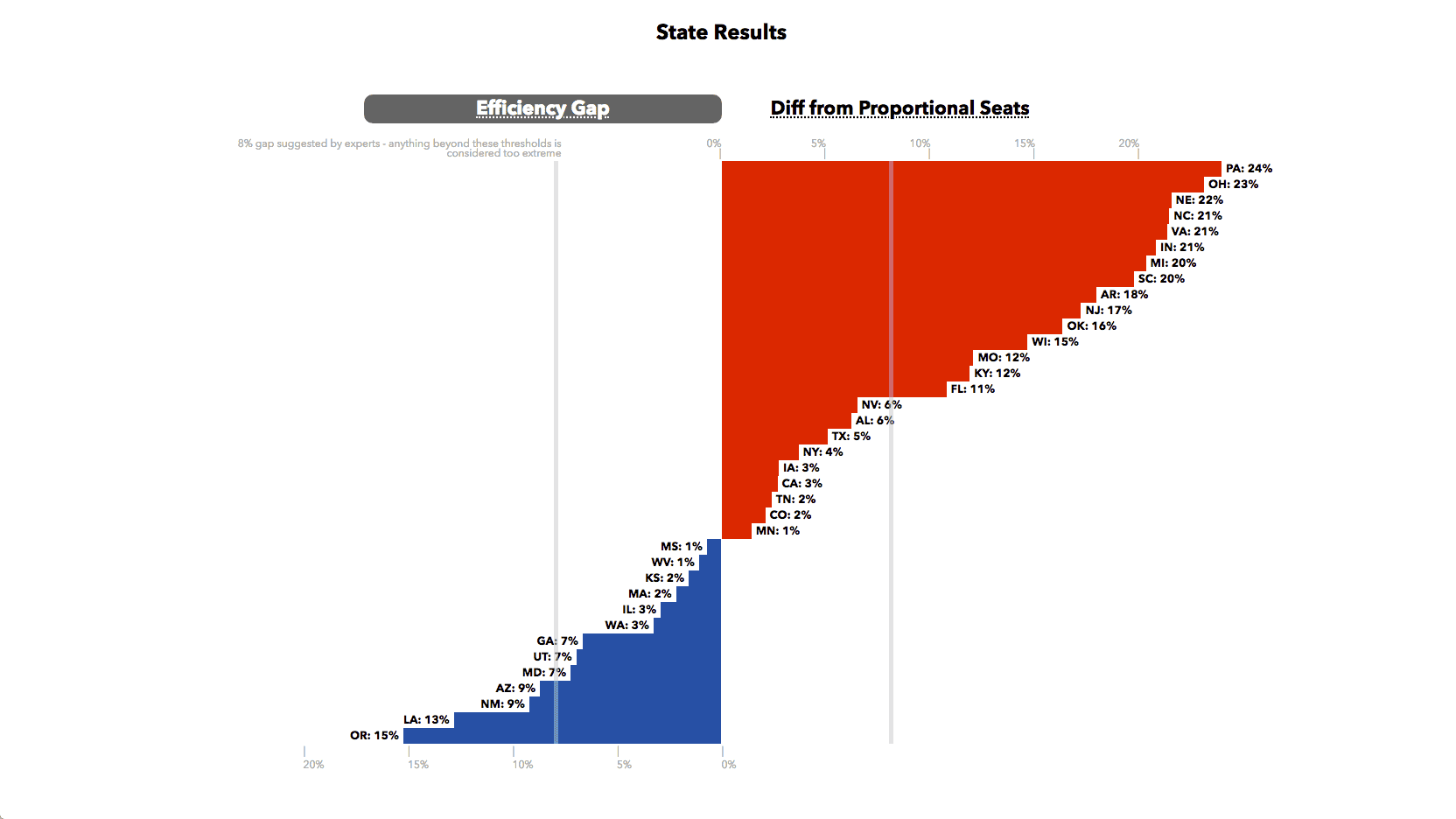 A straightforward state-level bar chart, created using jQuery and Flexbox, clearly communicates our primary metric, the efficiency gap, using a familiar visual language that allows us to quickly draw insight from the data. Using red and blue to distinguish our political parties requires little to no cognitive lift, while ranked ordering of states allows us to quickly see which states enjoyed disporoportionate advantages by each party. The reference lines show us cut-offs suggested by researchers, allowing us to quickly see which states cross thresholds of reasonability.