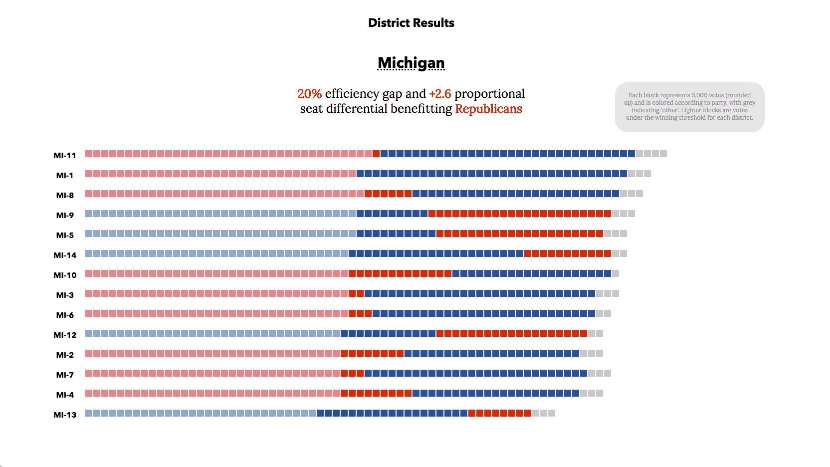 We can also use this view to help visually explain the methodology for calculating the efficiency gap. The emphasized 'darker' blocks are all 'wasted' votes per the efficiency gap definition - arranging the visualization this way matches the visual language of our introductory explanations and allows us to get a sense of the proportion of votes cast that were 'wasted' for each party.
