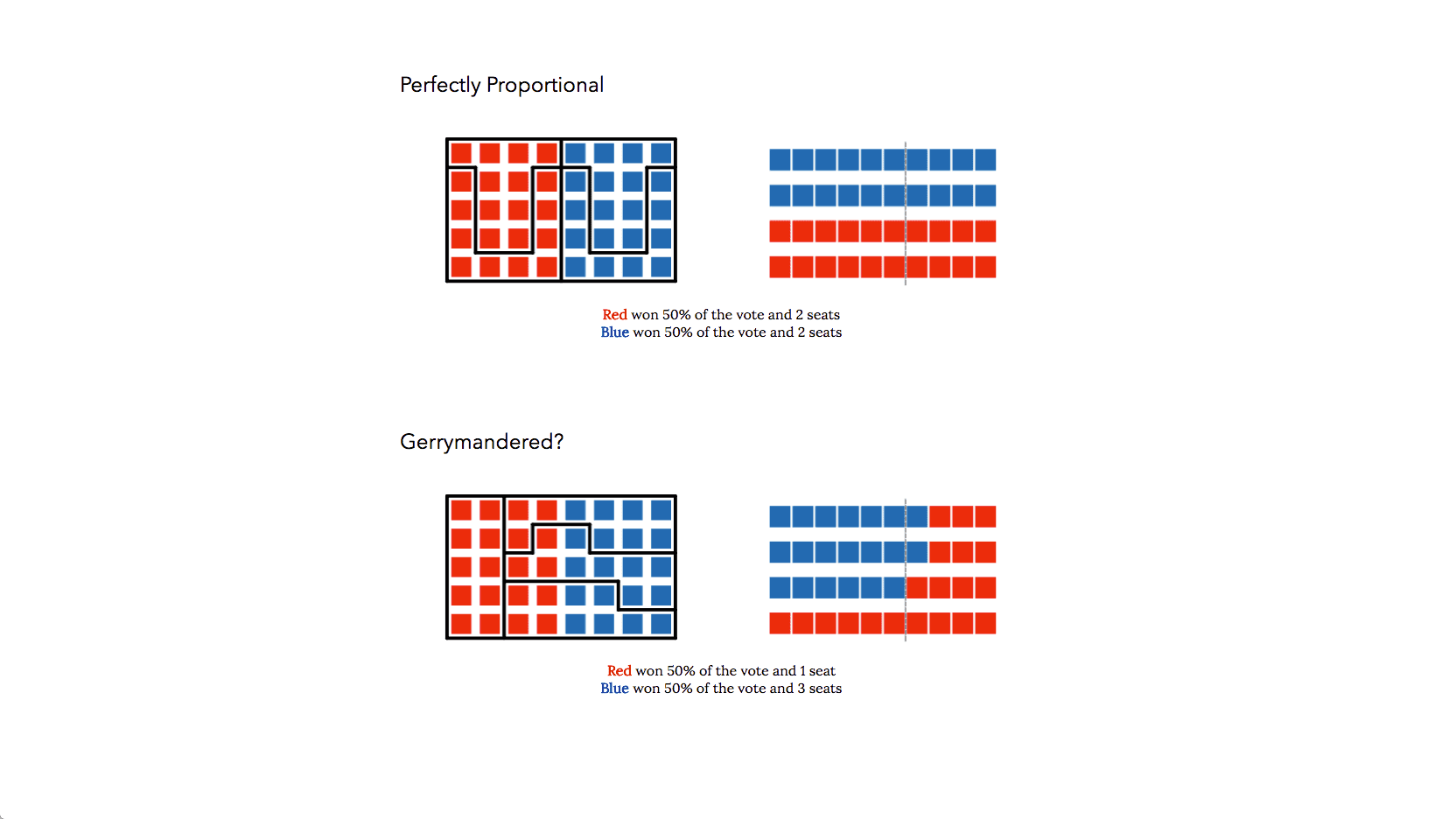 Our introduction and background sections help explain how gerrymandering works in a visual context, establishing a visual language of party colors, blocks of votes, and stacking these votes into district-level bar charts.