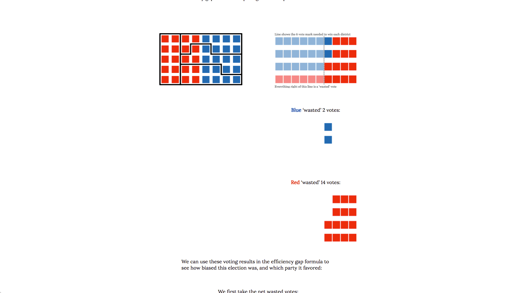 These introductory visuals also help explain how our main metrics are calculated - for the efficiency gap, what constitutes a wasted vote and how we visually distinguish these votes by lightening their opacity. When this visual language is maintained in our district-level visualization, we're able to more easily connect this theory and background with the results of the 2012 elections to understand the data behind our calculations.