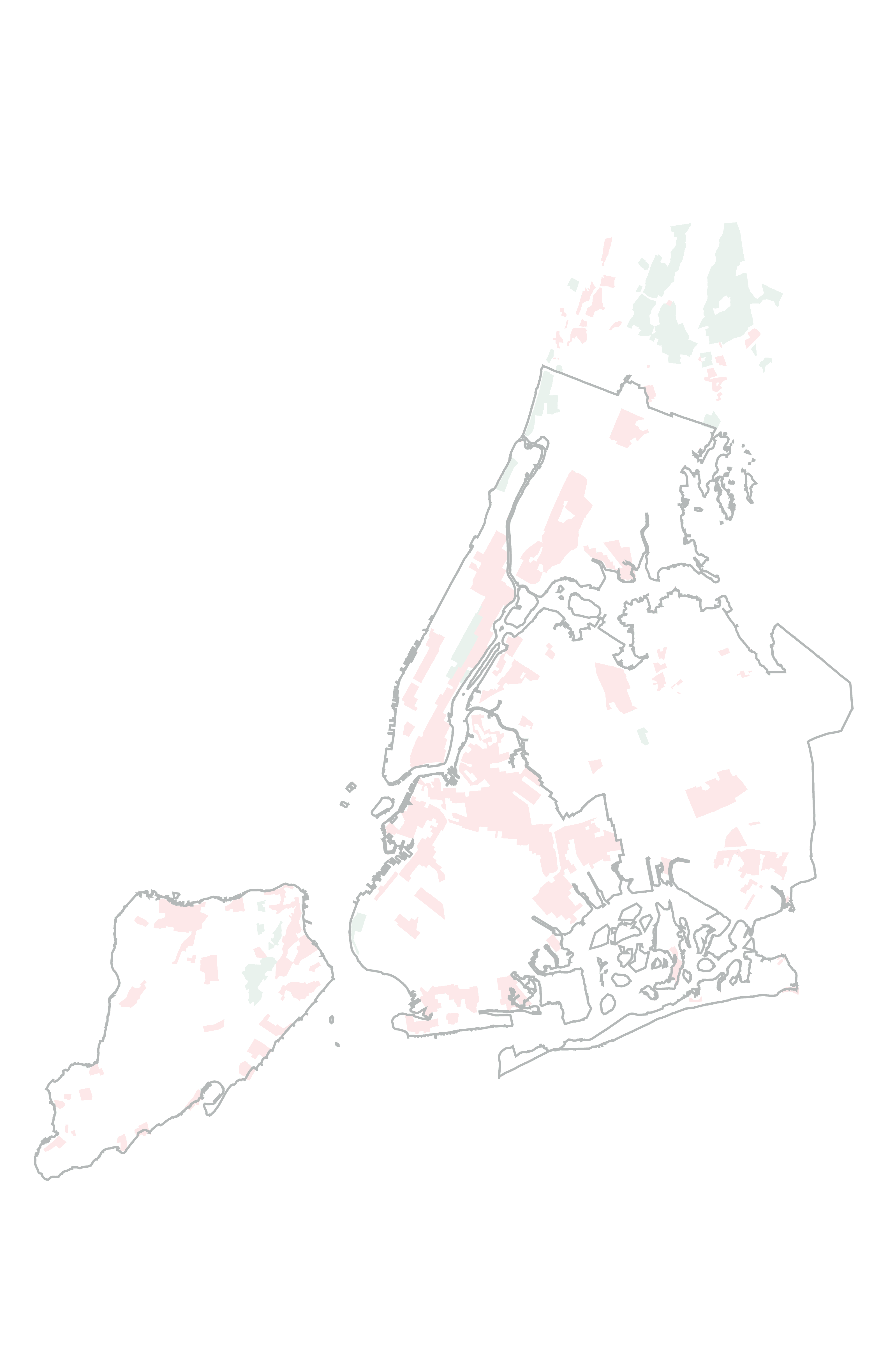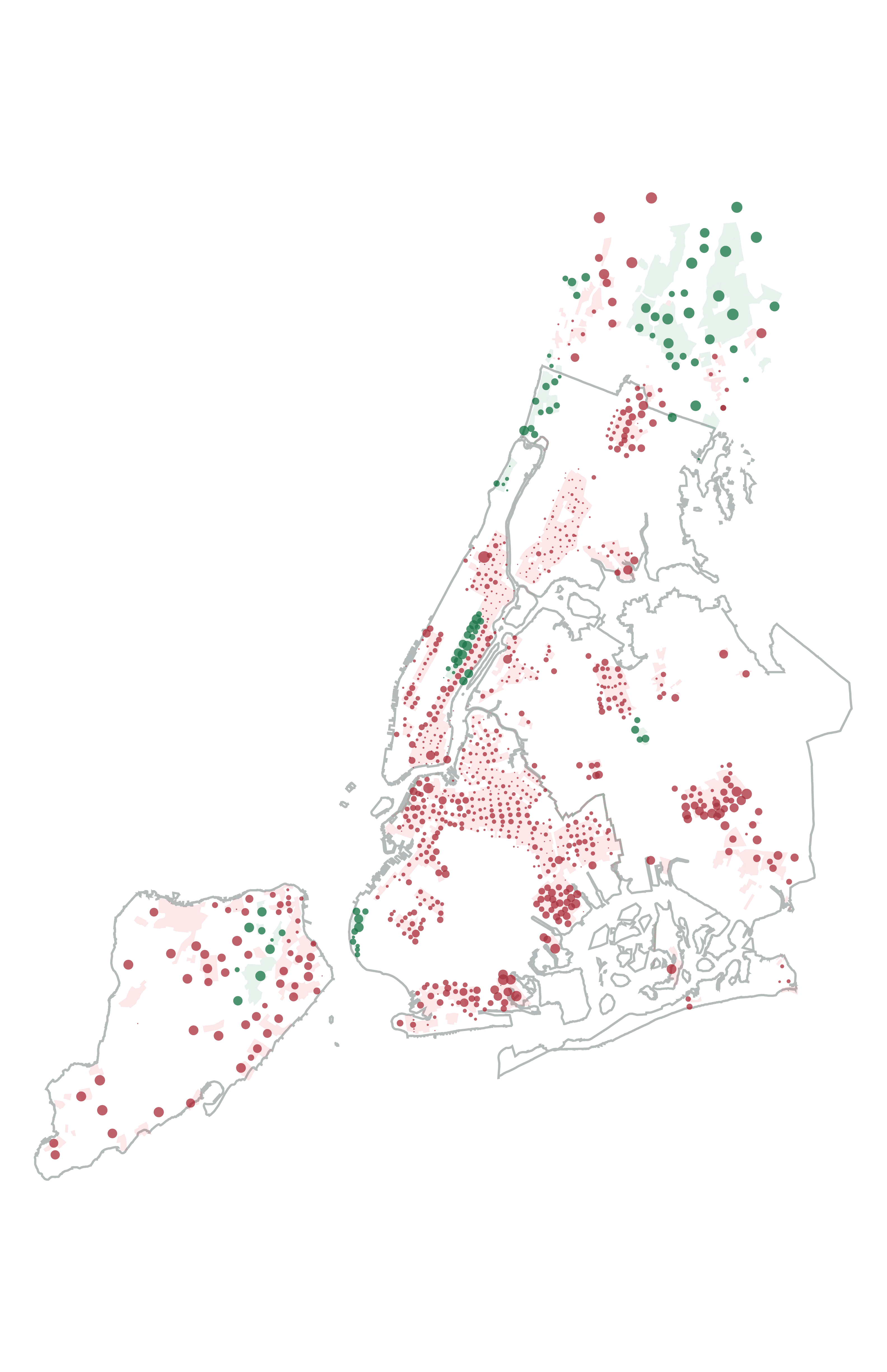 After completing this process, I explorted a GeoJSON file with geographic centerpoints, homeownership rates, and redlining grades for each census tract encompassed within New York City redlining maps. Using this data alongide boundary files for each redlining neighborhood and borough, I then wrote a script in d3 to draw SVG's of all my redlining neighborhoods and census tract dots. I used SVG Crowbar to save static copies of these SVGs from that webpage that I could then bring into Adobe Illustrator to create my final poster design.