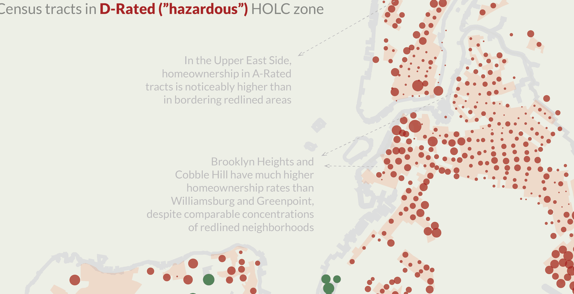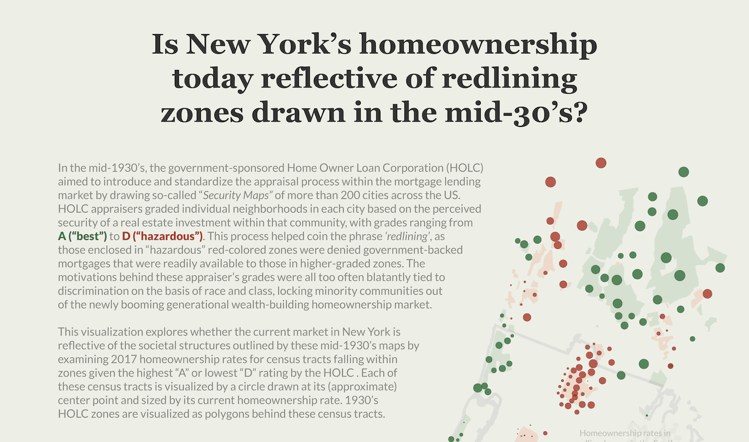 This poster investigates how contemporary hownership rates across New York City are reflective of housing discrimination and redlining from the 1930's