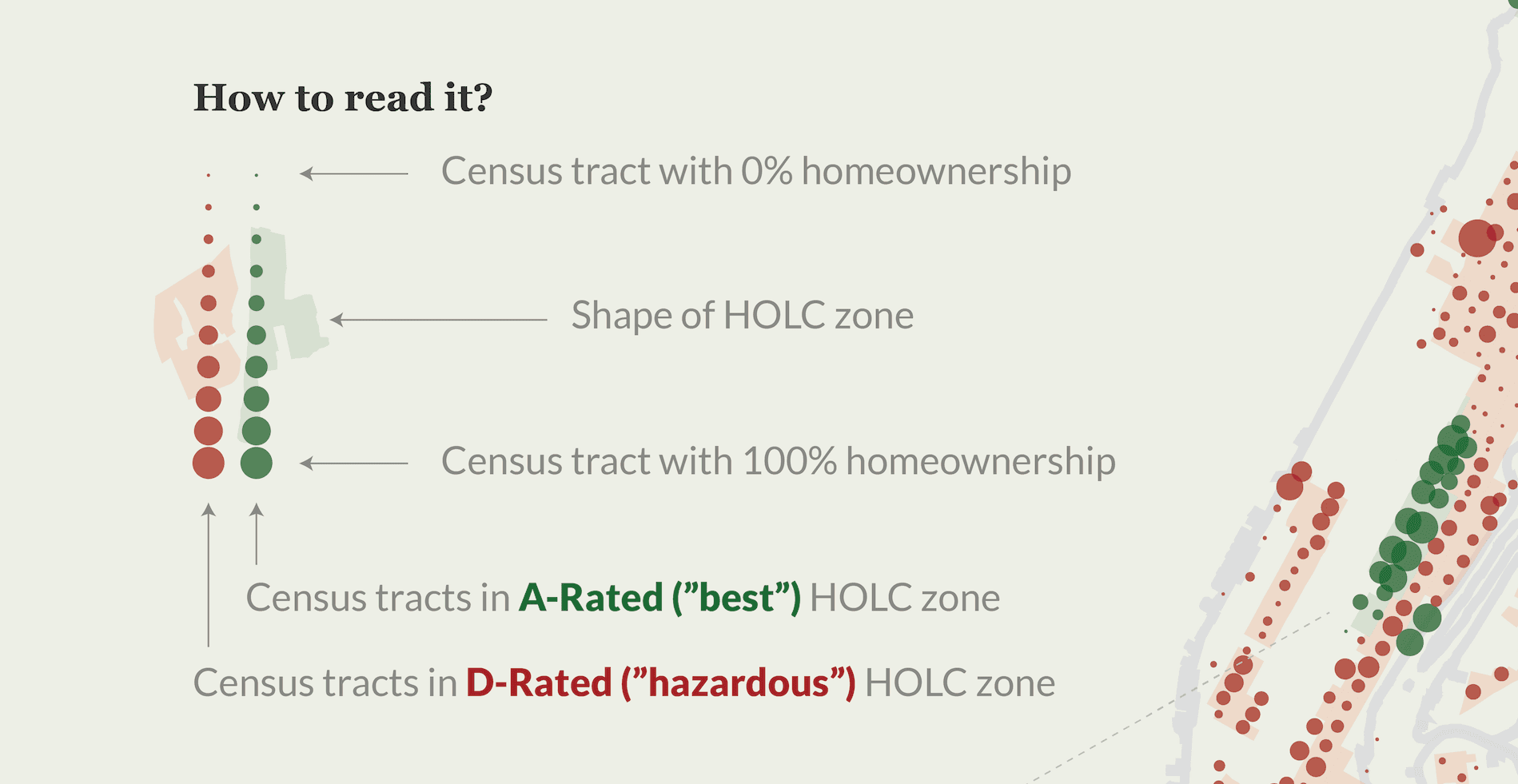 Each tract is represented by a circle centered on the tract's approximate midpoint, with size delineating homeownership rate and color delineating redlining grade. This approach visually highlights broad differences in homeownership rates across neighborhoods and emphasizes clusters of tracts with divergent homeownership rates. I only included the highest and lowest rated neighborhoods from the redlining maps, foregoing the two middle grades, since I wanted to simplify the poster's narrative while avoiding a cluttered visual.