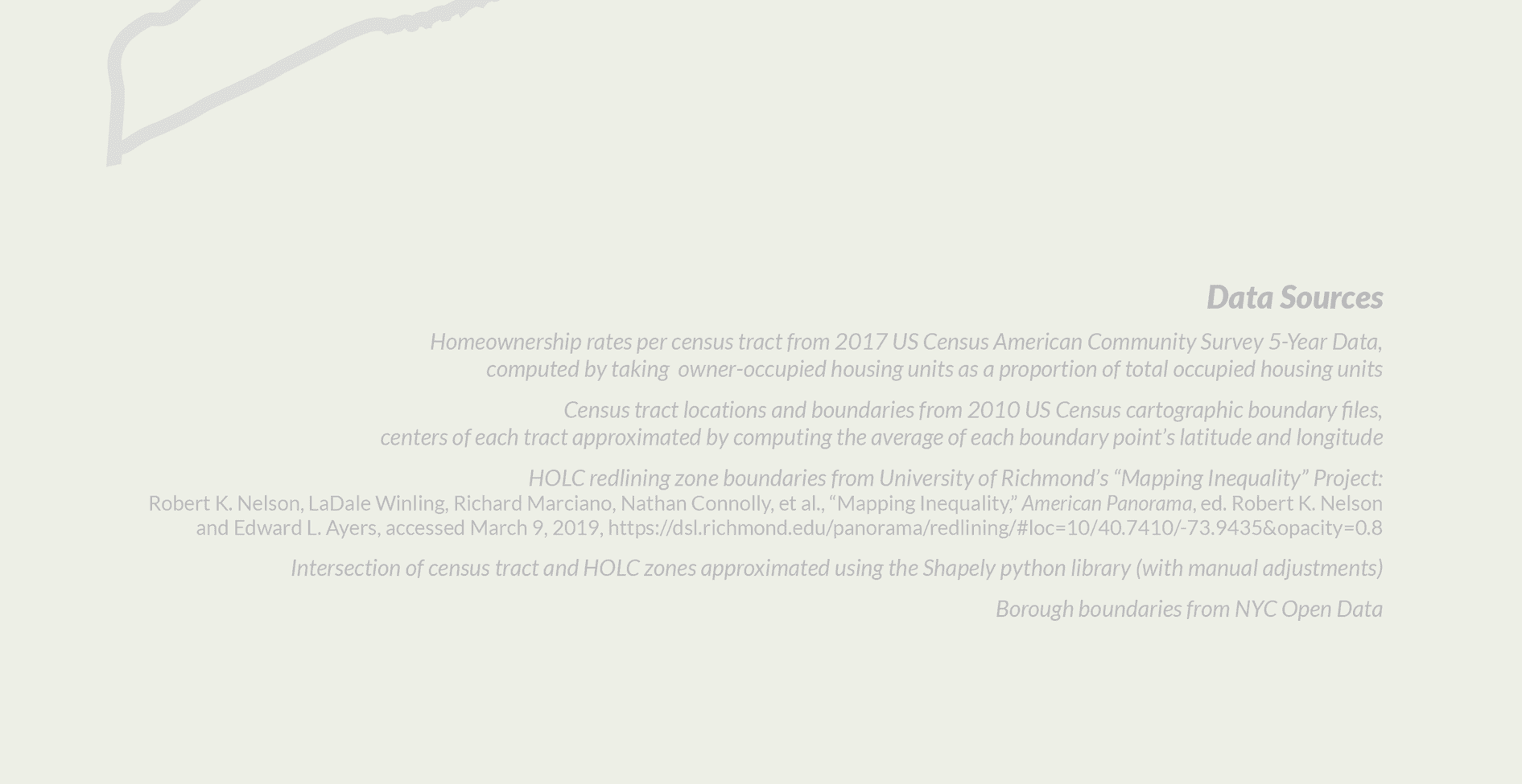 There were two main data sources in this project: redlining maps for all five New York boroughs and lower Westchester county from the Mapping Inequality project, and census data from the American Community Survey (ACS) 5-Year Data (2009-2017) with census tract boundaries from the US Census' 2010 Cartographic Boundary Files. I first calculated homeownership rates for each census tract in New York, along with estimating a tract's center point by taking an average of the latitudes and longitudes across that tract's boundary points from the cartographic boundary file.